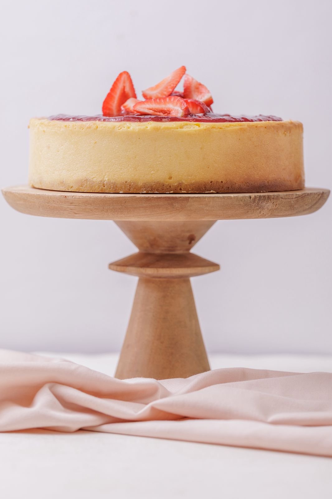 Clásico Cheesecake horneado, crema de queso densa y suave con topping artesanal de frutillas.