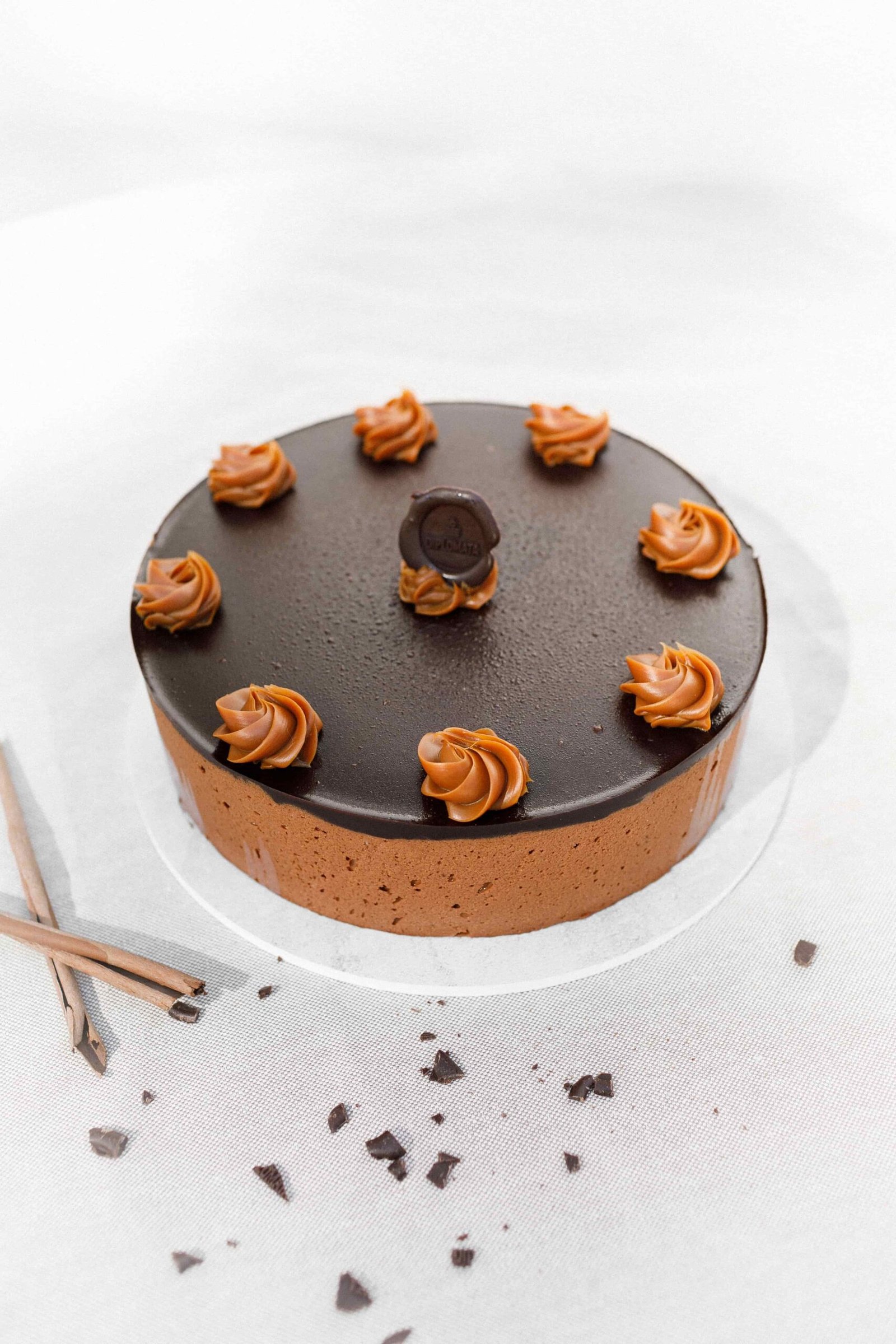 Mousse de chocolate oscuro con corazón de bizcochuelo chiffon y dulce de leche con baño brillante.