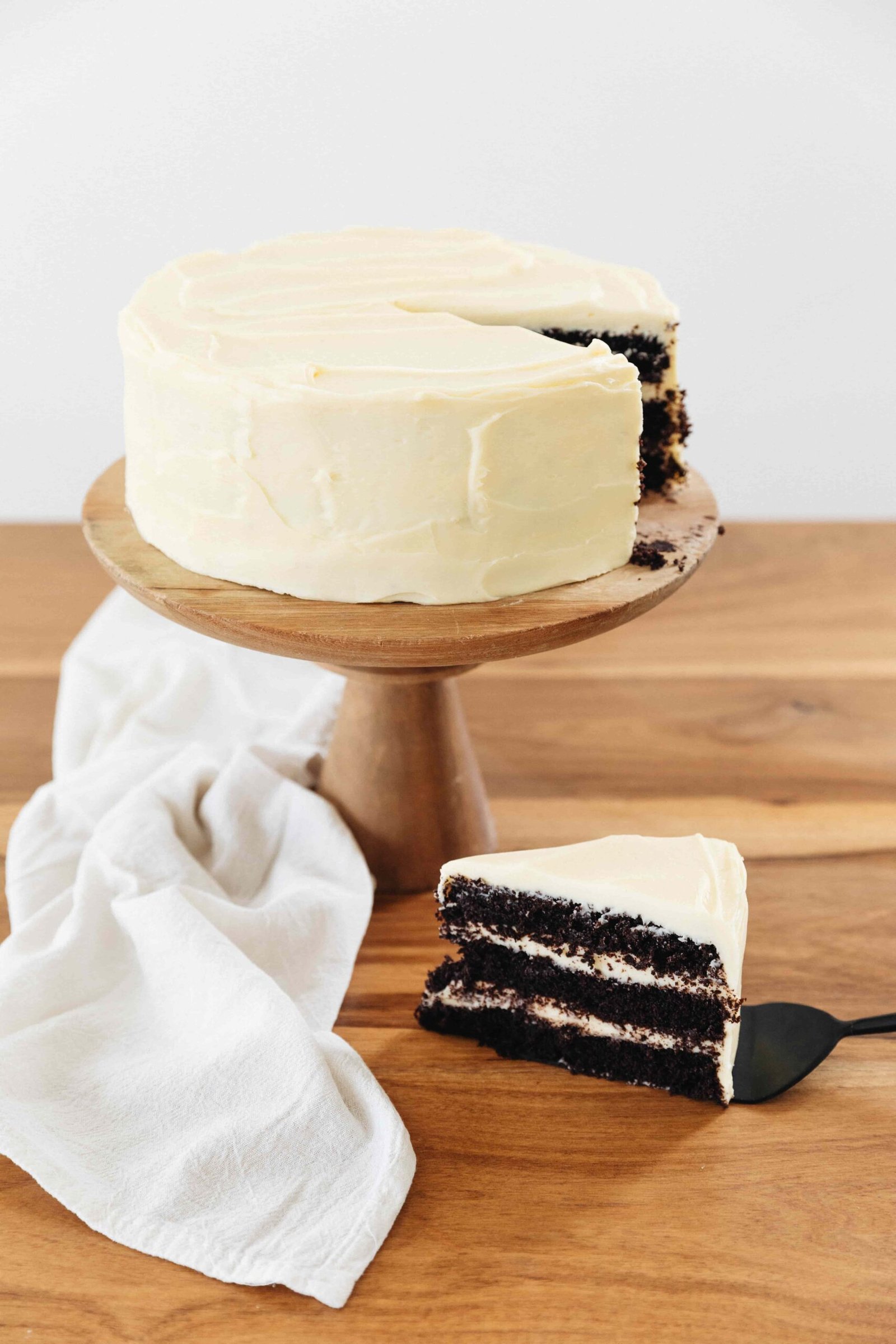 Capas de biscuit de chocolate oscuro con ganache de chocolate blanco.